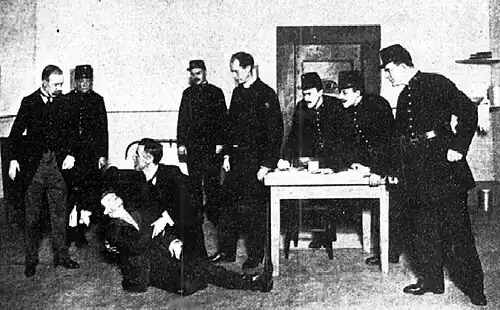 Gilbert was inspired by the celebrated Crippen murder trial of 1910.[2] As usual, Gilbert was thorough in his research, touring the Pentonville Prison and questioning its governor about procedures and also bringing the scenic designer to see it.[3] The piece was so grim and powerful that, according to Mrs. Alec Tweedie, "women [in the audience] had gone out fainting." The Hooligan was one of Gilbert's most successful serious dramas, and experts conclude that, in those last months of Gilbert's life, he was developing a new style, a "mixture of irony, of social theme, and of grubby realism,"[4] to replace the old "Gilbertianism" that he had grown weary of.[5] The main character, Solly, dies of a heart attack. Gilbert himself died of a heart attack only a few months after producing the play.