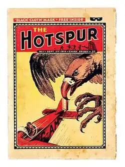 The Hotspur was launched on 2 September 1933[1] as a story paper, the last of the 'Big Five'.[2] The first issue came with a black mask as a free gift[3][4] and contained an offer for an electric shock machine: