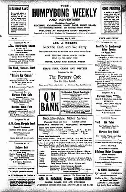 The Humpybong Weekly and Advertiser was a weekly English language newspaper printed and published by Richard Greenough Gardner in Redcliffe, Queensland and was first issued Thursday, 10 March 1927.[2] It was the first newspaper printed on the Redcliffe Peninsula.[3] From issue number 28 (Thursday 15 September 1927) the proprietors were recorded as Gardner and Leeming.[4] The publisher claimed a circulation in Redcliffe, Scarborough, Woody Point, Bribie Island and surrounding districts.[5] Reports of the Redcliffe City Council meetings give an insight into the issues of the time e.g. the construction of housing for families in need at Redcliffe during the Depression and employment of their breadwinners by Council.[6] The publication ceased on Thursday, 10 November 1932 due to lack of advertising support.[7]