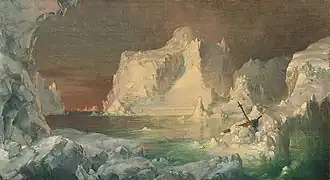 The Icebergs is an 1861 oil painting by the American landscape artist Frederic Edwin Church. It was inspired by his 1859 voyage to the North Atlantic around Newfoundland and Labrador. Considered one of Church's "Great Pictures"—measuring 1.64 by 2.85 metres (5.4 by 9.4 feet)[1]—the painting depicts one or more icebergs in the afternoon light of the Arctic. It was first displayed in New York City in 1861, where visitors paid 25 cents' admittance to the one-painting show. Similar exhibitions in Boston and London followed. The unconventional landscape of ice, water, and sky generally drew praise, but the American Civil War, which began the same year, lessened critical and popular interest in New York City's cultural events.