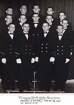 The Idlers were formed in 1957 by eight members of the USCGA Class of 1959 on summer cruise. They quickly drew the attention of the Academy's bandmaster Don Janse and began building their repertoire and fame. In the fall of 1957, the Idlers membership was extended to all Academy classes, as reflected in this photo, taken several months thereafter. Within two years the Idlers had recorded three vinyl albums (for both the Design[1] and MGM labels), and had performed for President and Mrs. Eisenhower at the White House and on The Bell Telephone Hour (NBC).[2]
