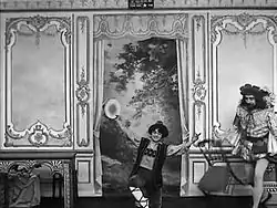 A magician dressed as a Renaissance-era nobleman forms a cylinder from a large sheet of paper, and after showing that it is empty, conjures a boy inside it. The boy proceeds to dance with a tambourine. Placing the cylinder back around the boy and laying him out recumbent between a stool and chair, the magician causes him to vanish within the cylinder. Emphasizing the feat by throwing the cylinder away, the magician then reconjures the boy atop a table before suddenly transforming him into a maiden towards whom he makes amorous advances. Just as the magician is about to kiss her, she transforms back into the boy, much to the magician’s displeasure. He transforms the boy back into the maiden, and after both bow to the audience together, they depart offstage arm in arm.