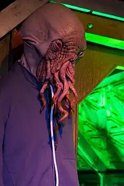 Executive producer and chief writer Russell T Davies said that an early draft of the script called for the role of the Ood to be filled by Raxacoricofallapatorians, the same species as the Slitheen. Their race would have been enslaved and they wished to awaken the Beast, whom they believed to be a god that could free them.[1] Davies chose the name of the Ood rather than Jones; he intended it to be a play on the word "odd".[1] In the accompanying Doctor Who Confidential episode, Davies said that he likes to think that the Ood come from a planet near to that of the Sensorites from the First Doctor serial The Sensorites (1964), as he suggests the races are similar in some respects.[2] In "Planet of the Ood", this is confirmed. During an interview with the production crew, it was noted that the sanctuary base was based on the spaceship Nostromo from the movie Alien.