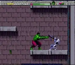 The Incredible Hulk is a side-scrolling action game with platforming and beat 'em up elements.[1][2] The player controls the Hulk, who is tasked with searching for the Leader while defeating his troops. The Hulk is capable of a variety of offensive techniques, and has four states of being that influence the moves at his disposal: "Hulk", "Super-Hulk", "Hulk-Out", and his human alter-ego Bruce Banner. The Hulk's state is determined by his amount of "Gamma", which doubles as his health. The Hulk begins the game in Super-Hulk mode; sustaining enemy attacks reduces his Gamma, and he will be reduced to a regular Hulk mode if his Gamma drops below 40%. Falling below 5% Gamma will transform the Hulk into Banner,[3] whose only means of offense is a gun with two shots,[4] and who cannot sustain any enemy attacks without dying.[5]