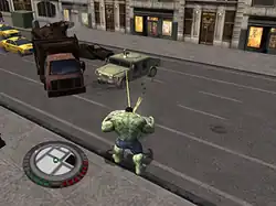 The Incredible Hulk is an action-adventure game in which the player controls the Hulk in an open world recreation of Manhattan.[1][2] The Hulk has various attacks and abilities that unlock and improve as the player progresses through the game and completes specific tasks (for example, jumping a certain distance or defeating a certain amount of enemies). The HUD features indicators of health and rage. The Hulk can regenerate any health lost from enemy attacks and refill health by collecting green canisters. Rage increases when the Hulk inflicts environmental damage and attacks enemies; if he is attacked, it is also possible to replenish rage by collecting red canisters. The Hulk can perform more powerful attacks requiring a certain amount of rage.[2]