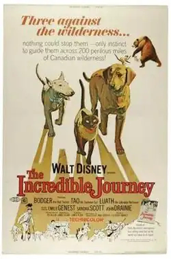 The Incredible Journey is a 1963 adventure film directed by Fletcher Markle and produced by Walt Disney Productions. Based on the 1961 novel of the same name by Scottish writer Sheila Burnford,[2] the film follows the adventure of Luath the Labrador Retriever, Bodger the Bull Terrier, and Tao the Siamese cat as they journey 300 miles (480 km) through the Canadian wilderness to return to their home. The film's human cast consists of Émile Genest, John Drainie, Tommy Tweed, and Sandra Scott, with Rex Allen providing narration.