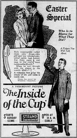 The Inside of the Cup is a 1913 best-selling novel by American writer Winston Churchill. The story was first serialized in Hearst's Magazine from April 1912 through July 1913 and was released in book form in May 1913. The best-selling book in the United States for 1913, it sparked a nationwide debate about the role of Christianity in modern life.