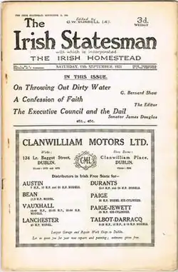 The Irish Statesman was a weekly journal promoting the views of the Irish Dominion League. It ran from 27 June 1919 to June 1930, edited by Warre B. Wells, assisted by James Winder Good,[1] and with contributions from W. B. Yeats, George Bernard Shaw, and George Russell ('AE').[2] The League's manifesto was first published in the journal's first issue.[3]