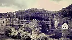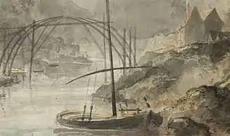 In 1997, a watercolour by Elias Martin was discovered in a Stockholm museum, which showed the bridge under construction in 1779.[28] The painting shows a moveable wooden scaffold consisting of derrick poles standing in the river bed being used as a crane to position the half-ribs of the bridge, which had been taken to the site by boat from Darby's foundry 500 metres (1,600 ft) downstream. Using the approach depicted in the painting, a half-size replica of the main section of the bridge was built in 2001 as part of the research for the BBC's Timewatch programme, which was shown the following year.[28][30]