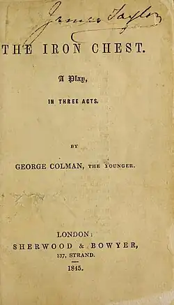 The Iron Chest is a 1796 play by the British writer George Colman the Younger after by the novel Things as They Are by William Godwin. Incidental music was composed by Stephen Storace. The play premiered at the Theatre Royal, Drury Lane in London on 12 March 1796.[1]