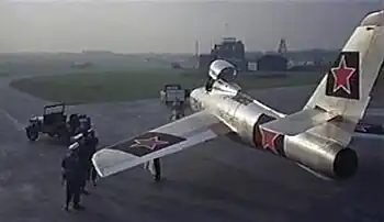 Production took place primarily at Pinewood Studios, but also utilized unique background locations, such as Buckingham Palace and Piccadilly Circus, as well as air bases in the UK. Although the plot involved a defecting military pilot, only a minimal number of aircraft appeared in the production, with the use of a Republic F-84F Thunderstreak as a stand-in for the ubiquitous MiG-15 jet fighter, the staple of 1950s Soviet air forces. Red-star markings appear on both the F-84F and C-47 to convert them to their Soviet lookalikes. When Kovelenko's MiG is escorted into West German airspace, two USAF North American F-86D Sabres intercept it. A Douglas C-47 Skytrain (as its counterpart, the Soviet Lisunov Li-2) is used for the return to Russia, while a Boeing Washington B.1 bomber and Avro Anson transport aircraft also appear, albeit mainly as backdrops.