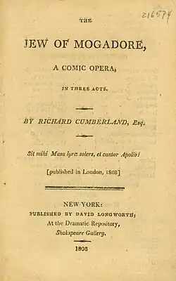 Cumberland had previously written a successful, sympathetic play The Jew about a Jewish moneylender. However The Jew of Mogadore met with critical hostility when it opened at Drury Lane.[1] The title character is a merchant operating out of Mogadore on the Moroccan coast.