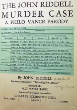 The John Riddell Murder Case: A Philo Vance Parody is a novel written by Corey Ford under the pseudonym of John Riddell. It was published in 1930. The book mocks a number of other best-selling books and authors of the time period.[1][2]