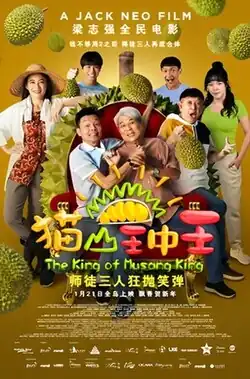 The King of Musang King (Chinese: 猫山王中王) is a 2023 Singaporean-Malaysian comedy film directed by Jack Neo.[1] The film stars Neo, Yeo Yann Yann, Mark Lee, Henry Thia, Gadrick Chin, Glenn Yong, Angeline Teoh and Jamie Chu.[2][3] Set in Raub, Pahang, Malaysia, the film follows an ambitious durian farmer Wang Mao Shan (Neo) who aims to expand his business overseas. He develops feelings for his neighbour and business partner Liu Mei Lian (Yeo) along the way but faces complications when her estranged husband Wang Jin Shui (Lee) returns. It also marks the on-screen reunion of Jack Neo, Mark Lee and Henry Thia after their previous collaborations in Money No Enough, That One No Enough, Money No Enough 2, Where Got Ghost? and Money No Enough 3. Secondly, It also marks another on-screen reunion of Yeo Yann Yann and Mark Lee after their previous collaborations as couples being wife and husband respectively in movies known as Being Human, Petaling Street Warriors and Lee Chong Wei. Moreover, it also marks another on-screen reunion of Yeo Yann Yann and Henry Thia after their previous collaboration in Love Matters where they both portrayed couples being wife and husband respectively. Furthermore, it also marks another on-screen reunion of Henry Thia and Gadrick Chin after their previous collaboration in Take 2. At the same time, besides Thia and Chin collaborating again, they also reprised their roles as Ah Hui and Sha Bao from The Diam Diam Era, The Diam Diam Era Two, Ah Boys to Men 3: Frogmen and Take 2 respectively. Also, it marks another on-screen reunion of Mark Lee, Henry Thia and Gadrick Chin after their previous collaboration in Number 1, in which Lee also portrayed a very similar role just like this film where both roles featured his characters looking for many jobs and work on them but ultimately were all failed attempts, which led them working as a drag queen in that film and durian seller with his family in this film respectively.