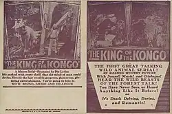 The King of the Kongo (1929) is a Mascot film serial, and was the first serial to have sound,[1] although only partial sound ("Part Talking") rather than the later (and now standard) "All-Talking" productions with complete sound. The first episode was a "three reeler" with the remaining nine episodes being "two reelers" (approximately 15 minutes per film reel).