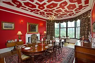 The Kirna was built between 1866 and 1867 by George Wilkie (1821-1892) of Hayfield Villa, Peebles for George Ballantyne (1836-1924), third son of Henry Ballantyne (1802-1865).[3] It was designed by British architect Frederick Thomas Pilkington.[4] It retains all of its original 1867 Scots Baronial and Venetian Romanesque design features including an idiosyncratic tower in Ruskinian Gothic style.[5] The heavy oak main staircase features distinctive turned and carved balusters identical to those found in F T Pilkington's own house, Egremont, 38 Dick Place, Edinburgh, and grotesque finials holding shields sporting the initials of George Ballantyne (1836-1924) and his wife Marion ("Minnie") White Aitken (1841-1914).[1][6] The hallway features a large glass cupola and an artist's studio is housed in the turret room.[7] The dining room ceiling incorporates the initials of Colin Ballantyne (1879-1942) and his wife Isabella Milne Welsh (1881-1969), respectively.[8]