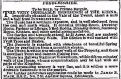 An 18th century map based on a 1741 survey by William Edgar which was dedicated to Charles Stewart (1697–1764), 5th Earl of Traquair shows a property, likely a farm house, named Kirna approximately 500 metres ENE of the current property, nearby the Walker Burn.[78] Its remains are no longer visible.