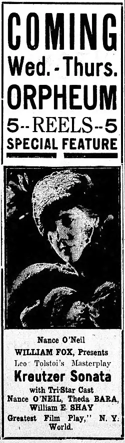 The Kreutzer Sonata is a lost 1915 American silent romantic drama film directed by Herbert Brenon and costarring Nance O'Neil, Theda Bara, and William E. Shay. The film was based on the 1902 play of the same name by Jacob Gordin, which was based on Leo Tolstoy's 1889 novella. Produced by Fox Film Corporation, it was shot at the company's studio in Fort Lee, New Jersey.[1][2]