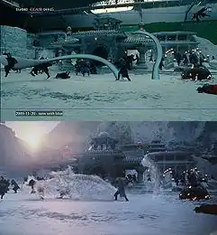 The film also used matte paintings, which had to be in 3D because the visual style included long-duration shots in which the camera always moved.[47] The climax, which was enacted on a 200 by 200 feet (61 m × 61 m) set, had to be merged with stills of the Greenland landscapes, as well as the low-angle lighting that was captured on location there.[47] The camera was animated to get angles needed for different shots in the film by importing these stills into the computer. Multiple cameras were utilized to achieve the different wire-work and animation that was used to create the creatures and many fight scenes within the film. In creating these creatures, the team looked at various real-world creatures to influence the look of the lemur Momo's wings.[47] In order for them to be believable, they looked for examples of the same size and weight as the animated character and then produced hybrids from different animals to make each species distinct. This was done by observing actual animals to get a take on how they would act.[47] Shyamalan's take on the personality of each creature also influenced the creation stage of the creatures. For example, Momo has flying mechanics based on a giant fruit bat. Other elements, such as texturing, hair or scale simulation, and light and shadow complementary to the live action, were added to make the final animation appear as real as possible during the later stages of character development.[47]