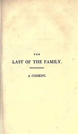 The Last of the Family is a comedy play by the British writer Richard Cumberland. It was first staged at Drury Lane Theatre on 8 May 1797[1] as a benefit performance for the actor John Bannister. The original cast included William Dowton as Sir John Manfred, John Bannister as Sir Adam ap Origen, Ralph Wewitzer as Squire Abel, Charles Kemble as Peregrine, Richard Suett as Beau Tiffany, Robert Palmer as Ned Flexible, Thomas Caulfield as George Ivey, John Hayman Packer as David Duncan, Jane Pope as Lady Manfred, Charlotte Tidswell as Lucy and Dorothea Jordan as Letitia Manfred.[2]