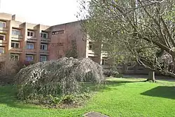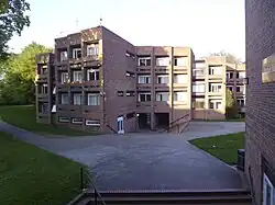 In 1961, Isi Metzstein and Andrew MacMillan of Glasgow-based firm Gillespie, Kidd and Coia were appointed to design accommodation for a further 1,000 students at The Lawns. They designed a series of twelve halls, each comprising five blocks identified by the letters A to E, and accommodating approximately 140 residents. A typical block configuration was three floors, with each floor accommodating nine students in seven rooms. The scheme was constructed between 1962 and 1968, when six of the projected twelve blocks were complete.[3] In that year, The Lawns was awarded a RIBA Bronze Regional Award.[4] In 1993, the six contemporary halls were designated as Grade II* listed buildings and are recorded in the National Heritage List for England, maintained by Historic England.[5][6][7][8][9][10]