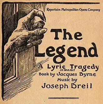 The Legend is a one-act tragic opera composed by Joseph Carl Breil to an English libretto by Jacques Byrne. It premiered at the Metropolitan Opera in New York City on March 12, 1919, in a triple bill with two other one-act operas, John Hugo's The Temple Dancer and Charles Cadman's Shanewis. Its melodramatic story is set in Muscovadia, a mythical country in the Balkans, and involves an impoverished nobleman turned bandit, his daughter Carmelita, and her lover Stephen, a captain in the hussars. The action unfolds over a single night at the end of which both lovers are dead—Stephen stabbed to death by Carmelita and Carmelita shot by Stephen's fellow hussars. The only one of Breil's six operas to be performed by a major opera company, The Legend received scathing press reviews and after its three performances at the Met disappeared from the repertory.