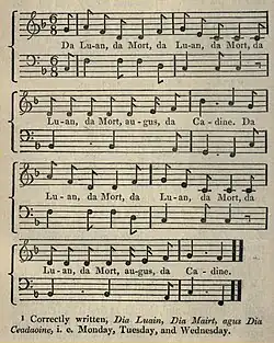 - ^ In the 3rd edition of 1834, the text was corrupted and became "augus Da Cadine, augus Da Hena", and footnoted as "And Wednesday and Thursday",[12] erroneously, as pointed out by Keightley, for "Da Hena" is Friday.[9] While Yeats retained the original correct days,[13] the erroneous version was unfortunately repeated by Joseph Jacobs,[14] as pointed out by a Japanese researcher.[15]