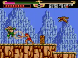 Gogan has a flashing "strength meter" on the top of the screen that determines how much damage he can inflict on enemies when he swings his axe. The strength meter empties after attacking and then slowly refills back to its maximum. The strength meter increases by 25% whenever the player collects a "crystal container". This incorporates an element of strategy in the game in which the player can either make a series of weak strikes with the axe or wait and build the strength meter for a single, more powerful strike.[3][5] Scattered throughout the game to help Gogan are miniature statues called "Jagu idols" that reveal power-ups when destroyed; these power-ups include "crystal containers" that increase Gogan's attack strength, wings that increase the speed of Gogan's attacks, power balls that help replenish Gogan's life meter, crystals that award bonus points, and extra lives.[3][6] Additional lives can also be obtained by earning certain numbers of points.[7]