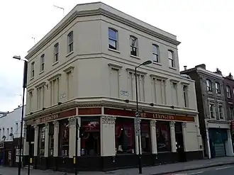 The building now housing The Lexington was erected in 1875–6. It was then known as The Belvidere, and was a new construction for the earlier tavern of that name on the same site, which had been there since about 1780.[4] It was designed by the architect W. E. Williams and built by Robert Marr.[3] Writing about the older tavern in 1882 in Notes and Queries, Edward Spencer refers to a discussion society "held there weekly, and some of our greatest ornaments of the bar and legal profession have there tested their oratorical skill" and that "in the parlour of an evening were once seen many of the authors, painters, artists, and literary men of the period."[5]