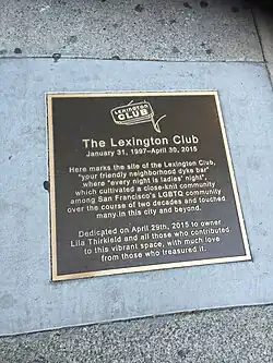 - ^ a b Quinlan, Julia (September 20, 2016). "Plaque Unveiled To Commemorate The Lexington Club". hoodline. Retrieved March 25, 2017.