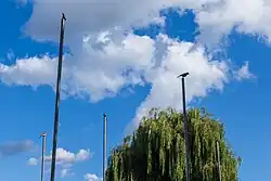 A sculpture of an electricity pylon balanced at an angle on its tip. It is 35 metres (115 ft) tall and weighs 15 tonnes. Originally commissioned for the 2015 London Design Festival.[31] |