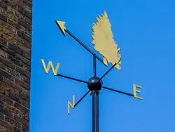 A weather vane in steel and gold leaf featuring a juniper tree, referencing both the artist's origins and a former gin distillery at Three Mills.[13] |