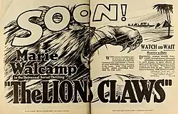 The Lion's Claws is a 1918 American adventure film serial directed by Harry Harvey and Jacques Jaccard and starring Marie Walcamp and Ray Hanford. The serial, which had 18 chapters, is considered to be a lost film.[1]