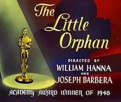 The Little Orphan is a 1949 American one-reel animated cartoon and the 40th Tom and Jerry cartoon, released in theaters on April 30, 1949 by Metro-Goldwyn Mayer.[1] It was produced by Fred Quimby and directed by William Hanna and Joseph Barbera, with music by Scott Bradley. The cartoon was animated by Irven Spence, Kenneth Muse, Ed Barge and Ray Patterson. The short features Nibbles, a young mouse who is insatiably hungry.[2]
