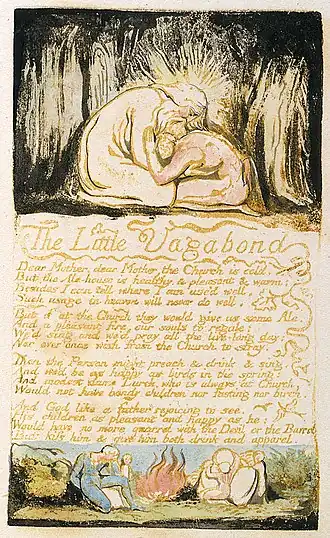 "The Little Vagabond" is a 1794 poem by English poet William Blake in his collection Songs of Innocence and of Experience. His collection, Songs of Innocence, was originally published alone, in 1789. The scholar Robert Gleckner says that the poem is a form of transformation of the boy in the poem "The School Boy", from Songs of Innocence.[2]