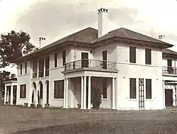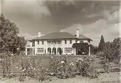 The Lodge is a 40-room Australian Georgian revival style mansion, located on 18,000 square metres (4.4 acres) of landscaped grounds. The origin of its name is unknown. It was built as a temporary measure, to be occupied by whoever was the prime minister "until such time as a monumental prime minister's residence is constructed, and thereafter to be used for other purposes". The original "prime minister's cottage" was built in 1926–1927 at a base cost of £25,000[2] and an eventual total of "£28,319 (approximately $2,298,825 AUD in 2020), including the landscaping of 2.8 hectares of grounds, construction of a tennis court and croquet lawn, and furnishing and interior decoration".[3] The architects were Percy A. Oakley and Stanley T. Parkes of Melbourne; the builder was J. G. Taylor of Sydney. Ruth Lane Poole of Melbourne was responsible for interior design and furnishing, as she had been for the governor-general's residence, Government House. The Lodge was intended as one of a set of three official residences, the others to be for the presiding officers of the Parliament of Australia (the speaker of the House of Representatives and the president of the Senate), but the others were never built.[4][5][6][7][8]