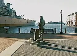 Rear Admiral William Thompson was the first president and CEO of the Navy Memorial Foundation, which raised the funds to create the Navy Memorial. As a tribute to Thompson's work to bring the memorial to life, sculptor Stanley Bleifeld placed Thompson's initials and last name on the sea bag.[1] The model for The Lone Sailor was Dan Maloney.[2][3][4] Maloney modeled in 1984 or 1985 when he was a Petty Officer First Class assigned to the submarine USS Alabama.[5] The Navy Times published Maloney's first person account of his selection and collaboration with Bleifeld on The Lone Sailor and Liberty Hound statues.[6] The Liberty Hound is located on the Jacksonville, Florida waterfront. There were several earlier designs for The Lone Sailor but the versions created from those sessions were not approved.[7] After the failed attempts using Navy Ceremonial Honor Guard models, Bleifeld asked New London Submarine Base for someone more typical.[8] As part of the casting process, the bronze for The Lone Sailor was mixed with artifacts from eight U.S. Navy ships, provided by the Naval Historical Center.