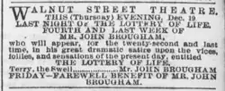 By August 1868, the Philadelphia Evening Telegraph reported that "Brougham has already made $1700 out of the piece of trash called "The Lottery of Life." "[14] Nevertheless, Brougham also converted the play into his first novel, which commenced a run in Fireside Companion that same month, and netted him an additional $2,000.[15][16]