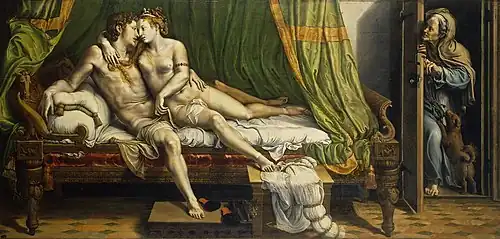 The Lovers, Two Lovers or Love Scene is an oil painting by Giulio Romano, painted in 1524–1525 on panel and later transferred to canvas by A Mitrokin in 1834. Since it was poorly stored and kept off public display because of its subject matter until 1920, it has significant damage, including three large breaks in the canvas sealed with coarse plasters on the reverse and other damage to the paint and varnish layer both before and after the transfer[1] It is now in the Hermitage Museum.
