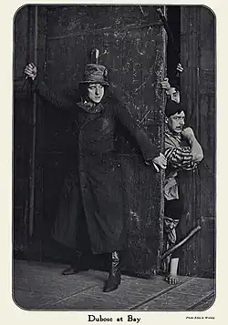 I have known the audience 'stagger' on the first appearance of Dubosc. Lesurques is hardly out of sight when Dubosc is there in the doorway, grim, sinister, the embodiment of wicked intent. His accomplices cower as he comes among them with contemptuous, insolent tolerance. Then, peremptorily, he issues his orders and from that moment dominates.[9]