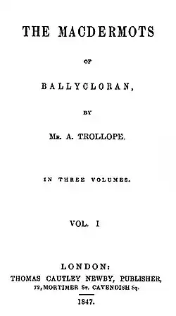 The Macdermots of Ballycloran is a novel by Anthony Trollope. It was Trollope's first published novel, which he began in September 1843 and completed by June 1845. However, it was not published until 1847. The novel was "an abysmal failure with the reading public."[1]