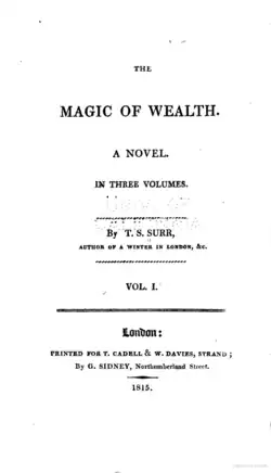 The Magic of Wealth is an 1815 novel by the British writer Thomas Skinner Surr, published in three volumes by Cadell & Davies in London. It focuses on the development of a new resort town by financial speculators. Surr negatively contrasts the speculative banker behind the development with the traditional elite represented by the local squire.[1] Thematically it is similar to Jane Austen's unfinished Sanditon (1817) and Walter Scott's Saint Ronan's Well (1823).[2] Surr's criticism of banks and financial speculation was a common theme in other novels of the era, including Thomas Gaspey's Calthorpe (1821).[3]