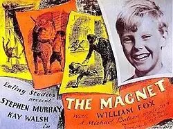 The Magnet is a 1950 British comedy film directed by Charles Frend and starring Stephen Murray, Kay Walsh, and in his first starring role James Fox (billed as William Fox).[3] It was written by T. E. B. Clarke. A young Wallasey boy obtains a magnet by deception, leading to much confusion. When he is acclaimed as a hero, he is shamed by his own sense of guilt.