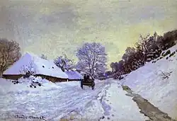 - ^ Musée d'Orsay Archived 2014-10-06 at the Wayback Machine: "With this choice of theme, Monet was following in the footsteps of Courbet who had tackled snowscapes in a number of genre scenes. But unlike the older painter, whose principal motif remained the stag and the hunter and who produced many anecdotal scenes, Monet painted an almost deserted landscape, where the cart and its occupant play a very minor role." The painting was originally dated 1865 by Monet. However, correspondence by painter Alexandre Dubourg points to a later date of 1867. In Moffett 1999, p. 80, Eliza Rathbone notes that the date is disputed by scholars.