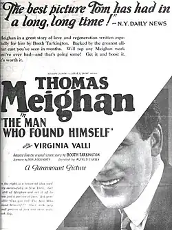 The Man Who Found Himself is a 1925 American silent drama film directed by Alfred E. Green and written by Thomas J. Geraghty based upon a story by Booth Tarkington.[1] The film stars Thomas Meighan, Virginia Valli, Frank Morgan, Ralph Morgan, Charles A. Stevenson, and Julia Hoyt. The film was released on August 23, 1925, by Paramount Pictures.[2][3][4]