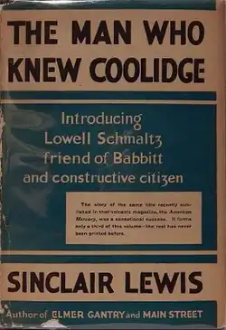 The Man Who Knew Coolidge is a 1928 satirical novel by Sinclair Lewis. It features the return of several characters from Lewis' previous works, including George Babbitt and Elmer Gantry. Additionally, it sees a return to the familiar territory of Lewis' fictional American city of Zenith, in the state of Winnemac. Presented as six long, uninterrupted monologues by Lowell Schmaltz, a travelling salesman in office supplies, the eponymous first section was originally published in The American Mercury in 1927.[2]