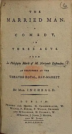 The Married Man is a 1789 comedy play by the English writer Elizabeth Inchbald, inspired by the 1727 French play Le Philosophe Marié by Philippe Néricault Destouches.[1] It premiered at the Theatre Royal, Haymarket in London on 15 July 1789.[2] The original cast included John Palmer as Lord Lovemore, John Bannister as Sir John Classick, James Aickin as Mr Classick, Stephen Kemble as Tradwell Classick, James Brown Williamson as Dorimant, Elizabeth Kemble as Lady Classick and Mary Whitfield as Lucy.