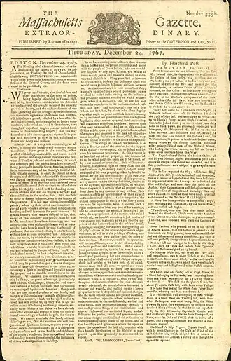Draper's father, John Draper, was the publisher of The Boston News-Letter who for thirty years was its publisher. On the death of his father in November 1762, Richard Draper took over publication of the News Letter. This newspaper was devoted to the royal British government and in the controversy between Great Britain and the colonies he, as a Loyalist, supported the British Crown through this newspaper. Richard enlarged the newspaper title to The Boston Weekly News Letter and New England' Chronicle. A year later he changed it again to The Massachusetts Gazette; and Boston News Letter and printed the emblem of the King's arms in the heading.[1][2] In 1768 it was united with The Boston Post-Boy. Draper's Post-Boy, was a Tory newspaper that seldom went afield from the British party line. He had the printing contract for Governor Bernard and the council and used the words Massachusetts Gazette as a part of the title.[3] The union of these two newspapers was something of an unusual match and lasted only a short term. Although the united newspapers were both called The Massachusetts Gazette, each continued as a separate publication; The Post-Boy was released on Mondays, with The News-Letter appearing on Thursdays. Together they came to be known as the "Siamese Twins" in journalism.[4][5] This arrangement lasted from May 23, 1768, until September 25, 1769. Draper, upon his separation of the twin newspapers, kept alive only The News-Letter.[6]