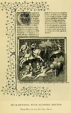 Several chapters from the previous work were also omitted, including sections on the ibex and the reindeer which were not relevant quarry for medieval Englishmen.[8] Other chapters omitted included those on trapping and the conduct of hunts in France,[7] including an early French description of a modest form of coursing hares for the pot, a la croupie, by a couple of men and their greyhounds.[9]