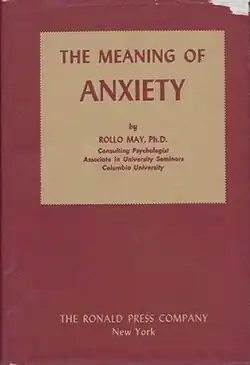 Meaning of Anxiety is a book by Rollo May. It was published first in 1950 and then again in a revised 1977 edition. The book is notable for questioning fundamental assumptions about mental health and asserts that anxiety in fact aids in the development of an ultimately healthy personality.[1][2][3] The revised edition discusses the in-between two and half decades of research on anxiety, especially that of Charles Spielberger. Other researchers and their work mentioned include Richard Lazarus, James Averill, and Seymour Epstein among others. May says his views are close to those of H. D. Kimmel, a critic of behaviorists.[4]